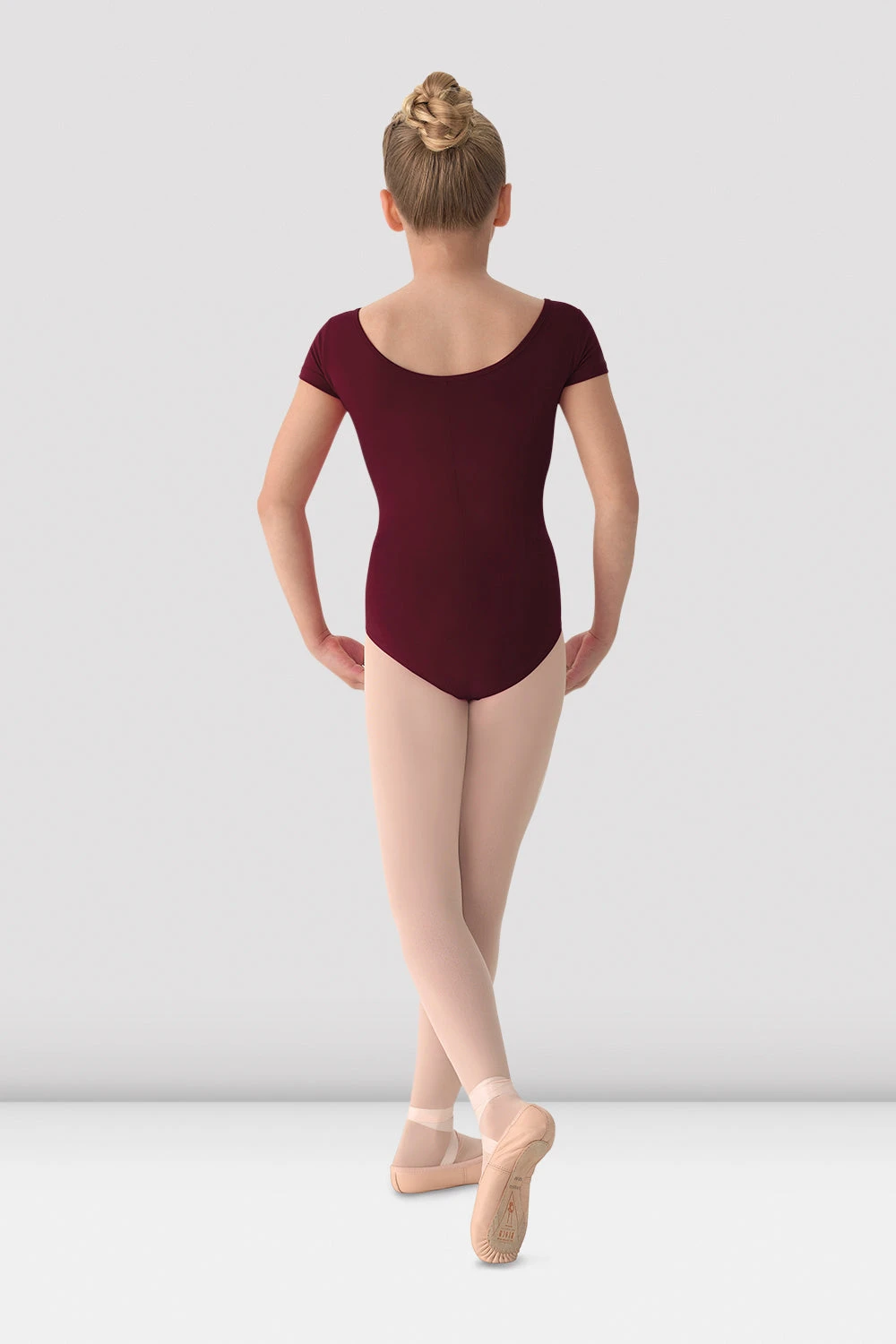 A stylish cap sleeve leotard for children that features a modest scoop neckline and front princess seams.