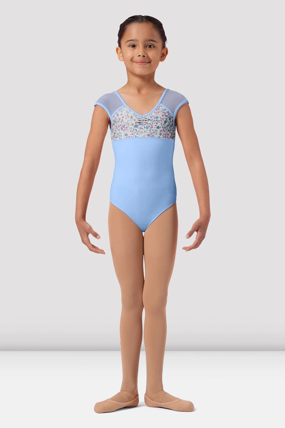 Our Girls Mirella Ditsy Floral Cap Sleeve Leotard features a scoop neck with mesh cap sleeves and floral print panels. Part of the Girls Mirella Ditsy Floral Collection with charming designs including delicate floral prints, soft mesh panels in a trio of enchanting pastel tones.